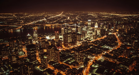 An expansive aerial perspective of a bustling city at night. Countless buildings and skyscrapers are illuminated, casting a warm, golden glow across the urban landscape. Streets are visible as ribbons of light, hinting at the constant movement of traffic. The sheer density of lights creates a vibrant and energetic atmosphere, showcasing the vastness and complexity of the metropolis after dark.
