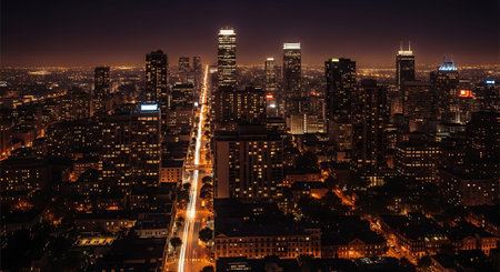 A vibrant night view of a city with illuminated skyscrapers, glowing street lights, and a sprawling urban landscape.