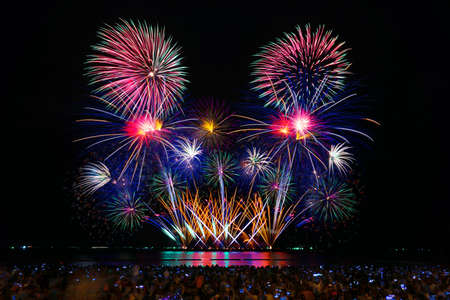 Beautiful colorful fireworks display for celebration happy new year and merry christmas in the city