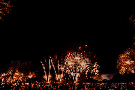 colorful fireworks,Beautiful multi color fireworks explosions lighting sky over trees silhouette and over an illuminated,celebration concept
