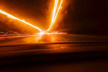 Driving at night. View from inside the car. Photo with a long exposure. Taken with a wide-angle optics.