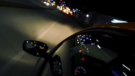 POV of car driving at night city with motion blur.