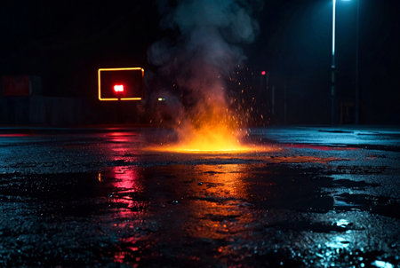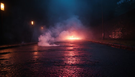 A large explosion erupts, emitting flames and clouds of smoke in an urban setting. Bright orange and red colors illuminate the surroundings, capturing attention in the dark night.