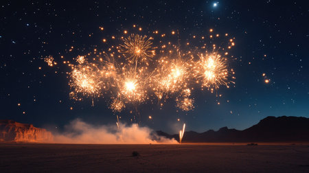 Fireworks burst over a desert horizon, lighting up the night sky, with room for text