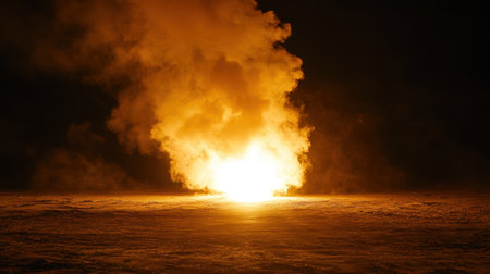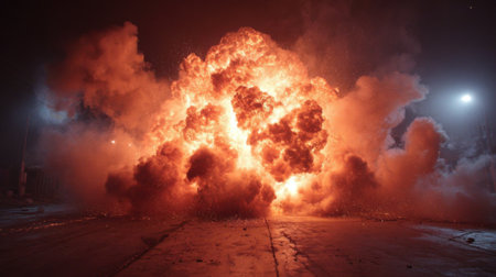A colossal explosion erupts with blindingly bright orange and red flames against a dark night sky. A massive, turbulent cloud of fire and smoke billows outwards, illuminating the immediate surroundings. The captures the raw power and destructive force of a significant blast, creating a dramatic and intense visual spectacle.