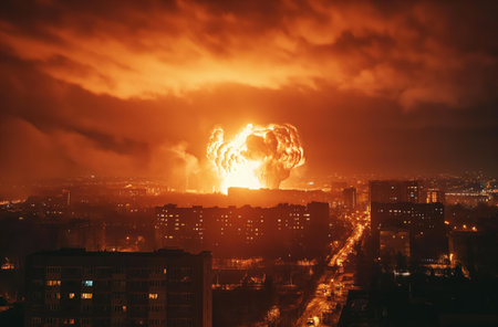 A spectacular nuclear explosion erupts in the night sky above a city, its fiery plumes creating a stark contrast against the urban skyline