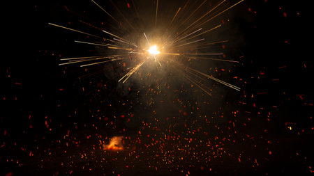 A stunning scene showcasing a burst of colorful sparks and fire, illuminating the dark night sky during a vibrant fireworks celebration, filled with energy and excitement.
