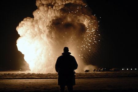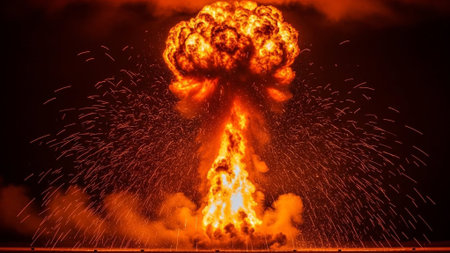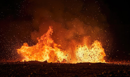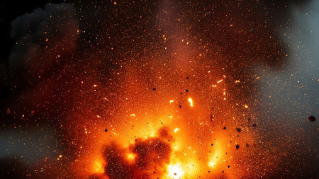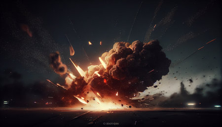 Intense night explosion with fiery blasts and billowing smoke, surrounded by flying sparks and debris, creating a dramatic and chaotic scene.