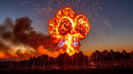 A powerful explosion erupts, creating a stunning display of fireballs and dark smoke against a dramatic sky, evoking feelings of awe and danger.