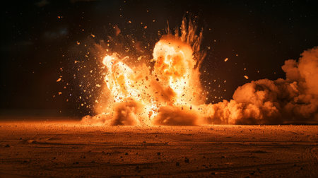 A fiery explosion lights up the night desert, scattering debris and creating dramatic plumes of smoke and fire.