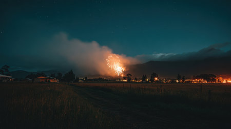 A breathtaking view of vibrant fireworks illuminating a quiet town at night, surrounded by rolling fog and a starry sky, capturing the essence of celebration and tranquility.