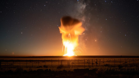 Huge explosion on the field at night. Generative AI