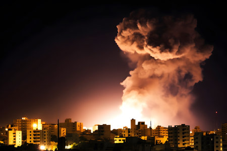 Explosions illuminating night sky during Israeli military operations. Israel occupies gaza and Jerusalem