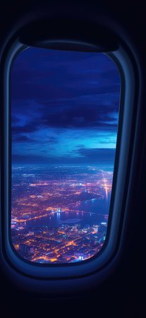 An airplane soars above a city at night, revealing a stunning aerial view of vibrant lights and a picturesque skyline, capturing the essence of urban beauty.