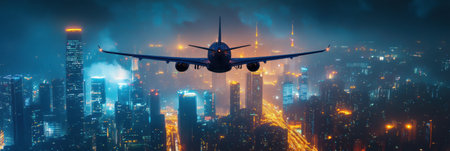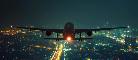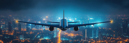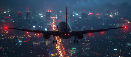 Commercial airplane soaring above a vibrant city, illuminated by countless lights at night, capturing the essence of modern travel and the dynamic beauty of urban landscapes