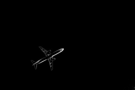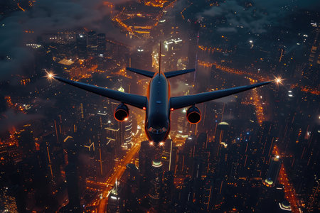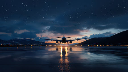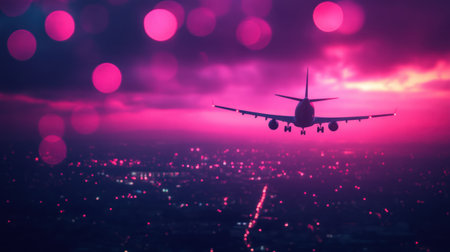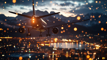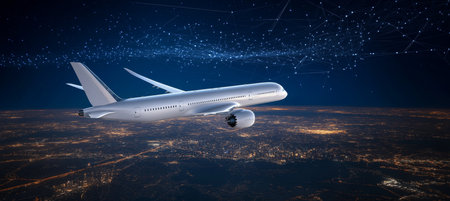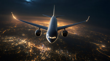 An airplane silhouette is featured, gliding against a dark, starry backdrop. The composition highlights the aircraft's shape and wing span. Illuminated lights suggest the presence of a city. This image could be used for aviation, travel, or conceptual projects, emphasizing flight, technology, and travel.