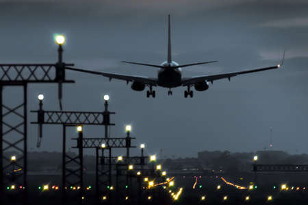A plane descends onto a runway as twilight fades. The lights illuminate the scene.