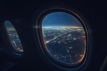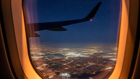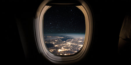 Looking out of the window of the plane, sitting in the cabin, night sky with Generative AI