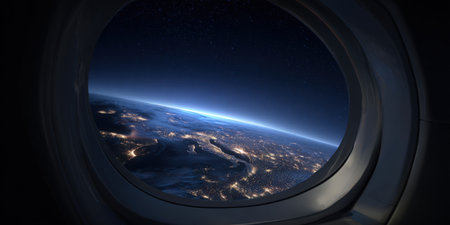Earth from an aircraft porthole at night, glowing city lights across continents beneath a blue atmospheric halo, distant stars and the curved horizon suggesting orbit and exploration
