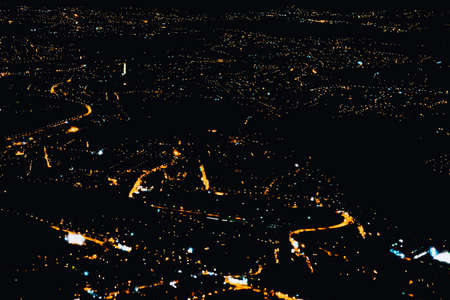 Aerial view of Bangkok from airplane at night. Capital of Thailand.