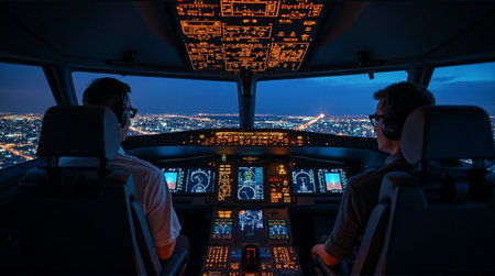 Pilots navigate a night flight over the glowing cityscape with modern cockpit technology