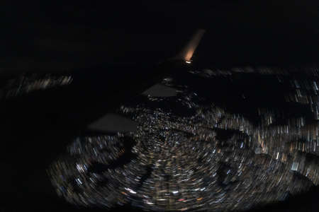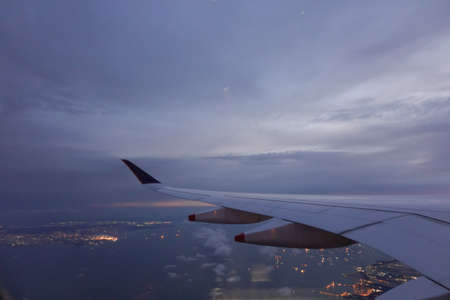 Airplane flight in sunset sky over earth of city light and wing of plane. View from the window of the Aircraft. Traveling in air.