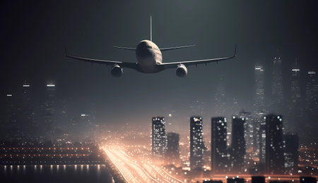 Midnight Expedition: Plane Navigating Urban Skyscape