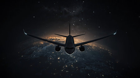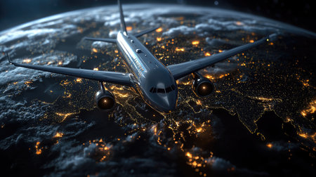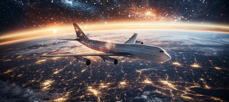 Futuristic Air Travel Airplane Soaring Above Illuminated Earth with Starry Universe Background