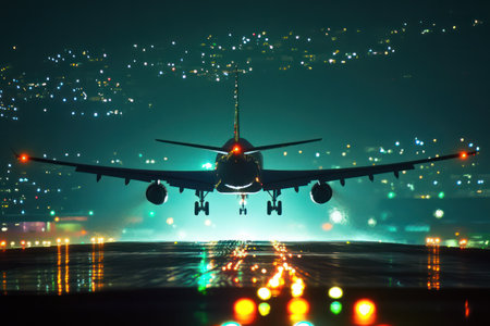 A stunning nighttime scene captures an airplane landing on a wet runway, illuminated by vibrant lights and surrounded by a misty atmosphere, evoking travel emotions.