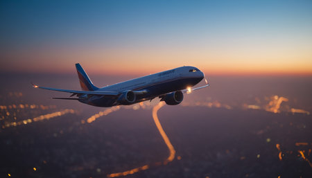 Airplane Soaring Above a Networked Cityscape at Night Symbolizing Global Travel and Connectivity
