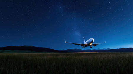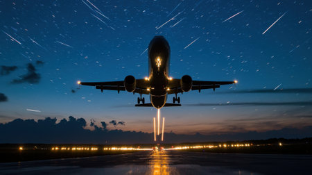 A night scene of an airplane taking off with its landing lights shining brightly, set against a starry sky, capturing the magic of flying under the stars.