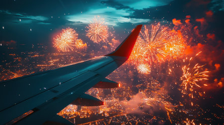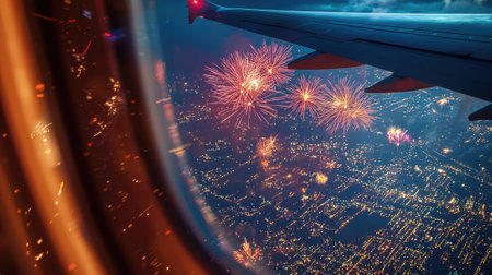 A breathtaking view from an airplane window showcases colorful fireworks lighting up the night sky above a bustling city. The vibrant city lights create a stunning contrast.