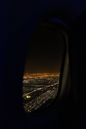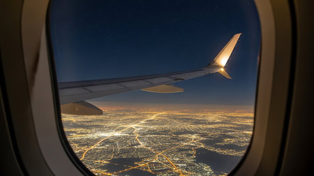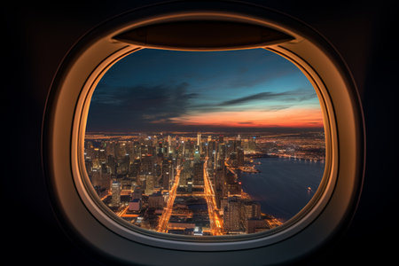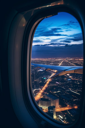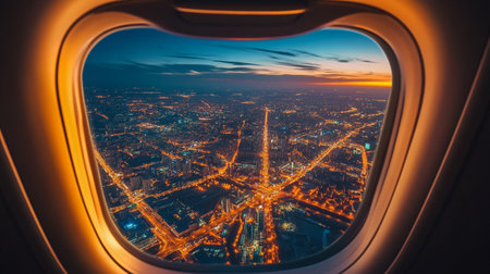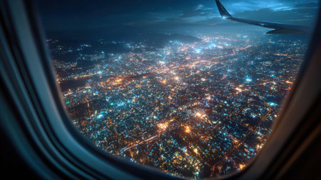 View of the night city from the airplane window. City view through the aircraft window. Travel and tourism concept. Generative AI