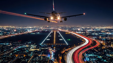 Airplane approaches futuristic city skyline illuminated at night with bright lights and modern architecture