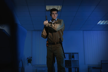 Portrait of Professional Police Officer Unholsters His Gun and Starts Aiming it at Criminal, Orders to Stop Resisting Arrest. Get On the ground. Hands Behind Back. Dramatic Cinematic Shot
