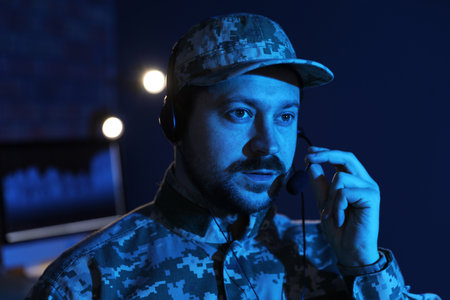 Army soldier in Combat Uniforms with an assault rifle and combat helmet night mission dark background. Blue and purple gel light effect.