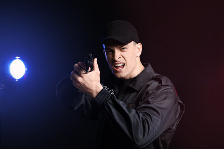 In police uniform. Neon lighting. Young european man is in the dark studio