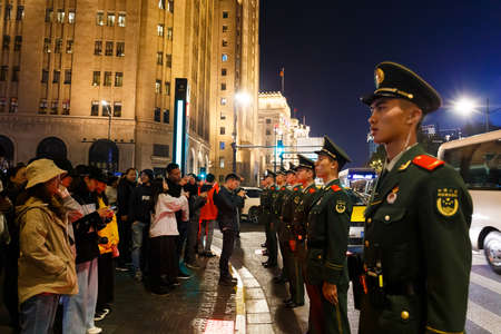 China Soldiers standing in attention position in front of The Bund, Shanghai China beside the traffic with curious tourists