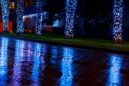 Trees decorated with garlands in the Christmas night . Illumination reflection in the wet pavement
