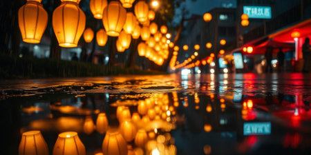 Lanterns glow softly along a wet street, casting reflections in puddles. The atmosphere is enchanting, enhancing a lively urban evening in the city.