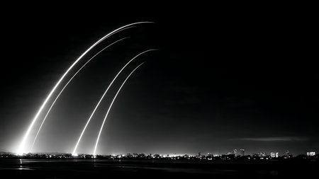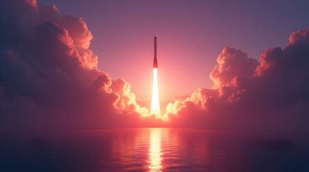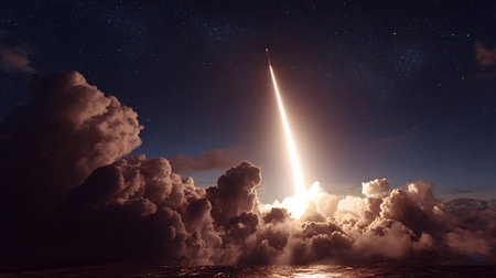 Space rocket ascending during a night launch, creating a dramatic bright plume of exhaust smoke against a dark, star filled sky over water, representing ambition and exploration