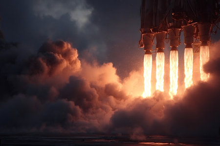 Four powerful rocket engines igniting, producing intense flames and billowing smoke clouds during a dramatic launch at dusk, showcasing the awesome of space exploration and technology