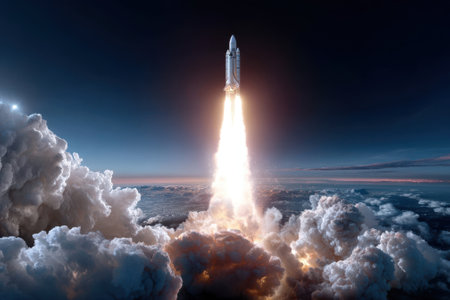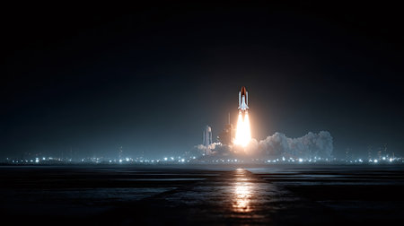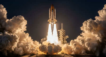 Space shuttle rocket launching into the night sky, creating vast clouds of smoke and bright fire trails, symbolizing innovation, exploration, and the future of technology