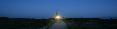 Meteorological station and a lighthouse at night, a view from the road at night. Pointe du Raz in Brittany, France. Travel destinations, landmarks, navigation. Panoramic image