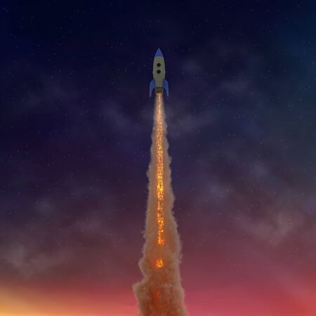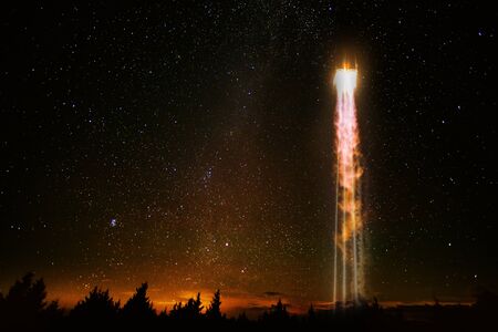 Successful take off of a spaceship against a starry sky. Rocket with smoke starts up. launch concept
