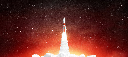 Spaceship takes off into space. Rocket launch into the sky with stars. Project start concept