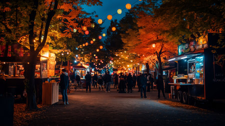 A lively night market illuminated by string lights, featuring food stalls and colorful autumn foliage. The bustling atmosphere and warm glow create a festive and cozy fall evening scene.