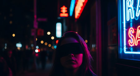 A woman wearing a virtual reality headset stands amidst the glowing neon signs of a city at night, her face partially illuminated by the colorful light, creating a cyberpunk atmosphere.
