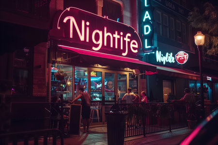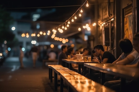 Bokeh background of street bar beer restaurant, outdoor in asia, people sit chill out and hang out dinner and listen to music together in avenue, happy life, work hard play hard. Generative AI