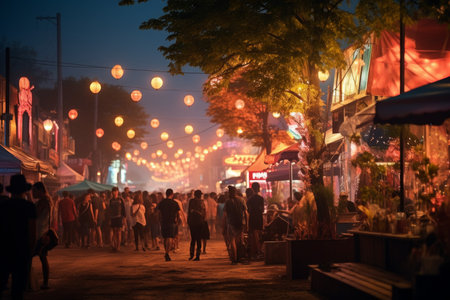 Blurred image of people walking in night market, bokeh background.